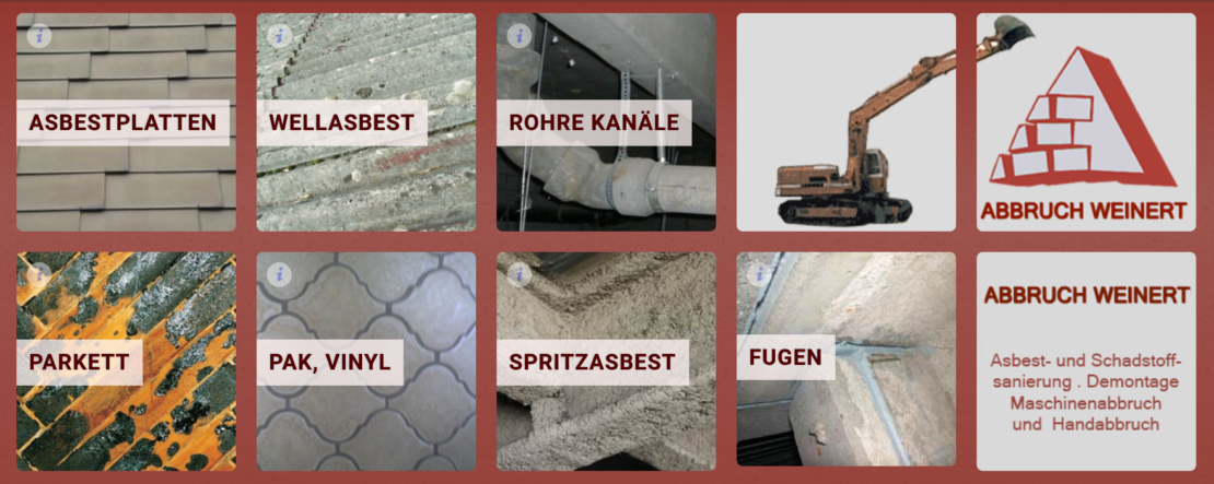 Sanierungs- und Instandhaltungsarbeiten an und in mit Schadstoffen kontaminierten Gebäuden sowie Hand-und Maschinenabbruch für Privatkunden, Handwerks-/Industriebetriebe, Architekten, Städte/Gemeinden: in Zusammenarbeit mit der BG Bau und den Umweltämtern