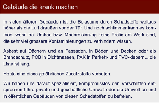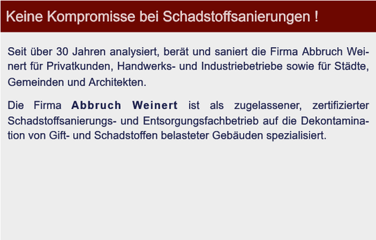 Sanierungs- und Instandhaltungsarbeiten an und in mit Schadstoffen kontaminierten Gebäuden sowie Hand-und Maschinenabbruch für Privatkunden, Handwerks-/Industriebetriebe, Architekten, Städte/Gemeinden: in Zusammenarbeit mit der BG Bau und den Umweltämtern
